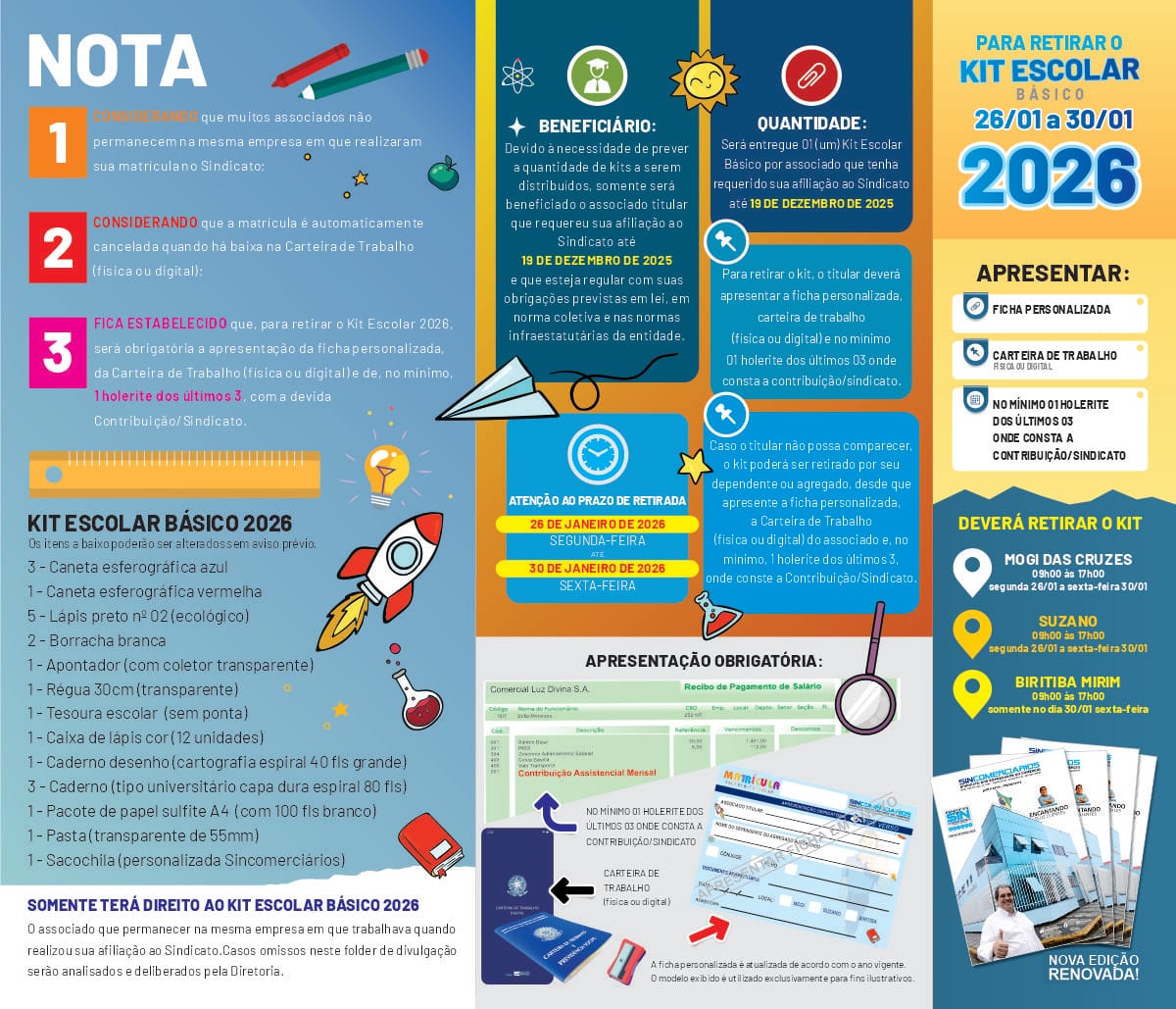 FICOU ESTABELECIDO QUE: Para retirar o Kit Escolar 2026 será obrigatória a apresentação da ficha personalizada, carteira de trabalho (física ou digital) e no mínimo 01 holerite dos últimos 3 onde consta a Contribuição/Sindicato.